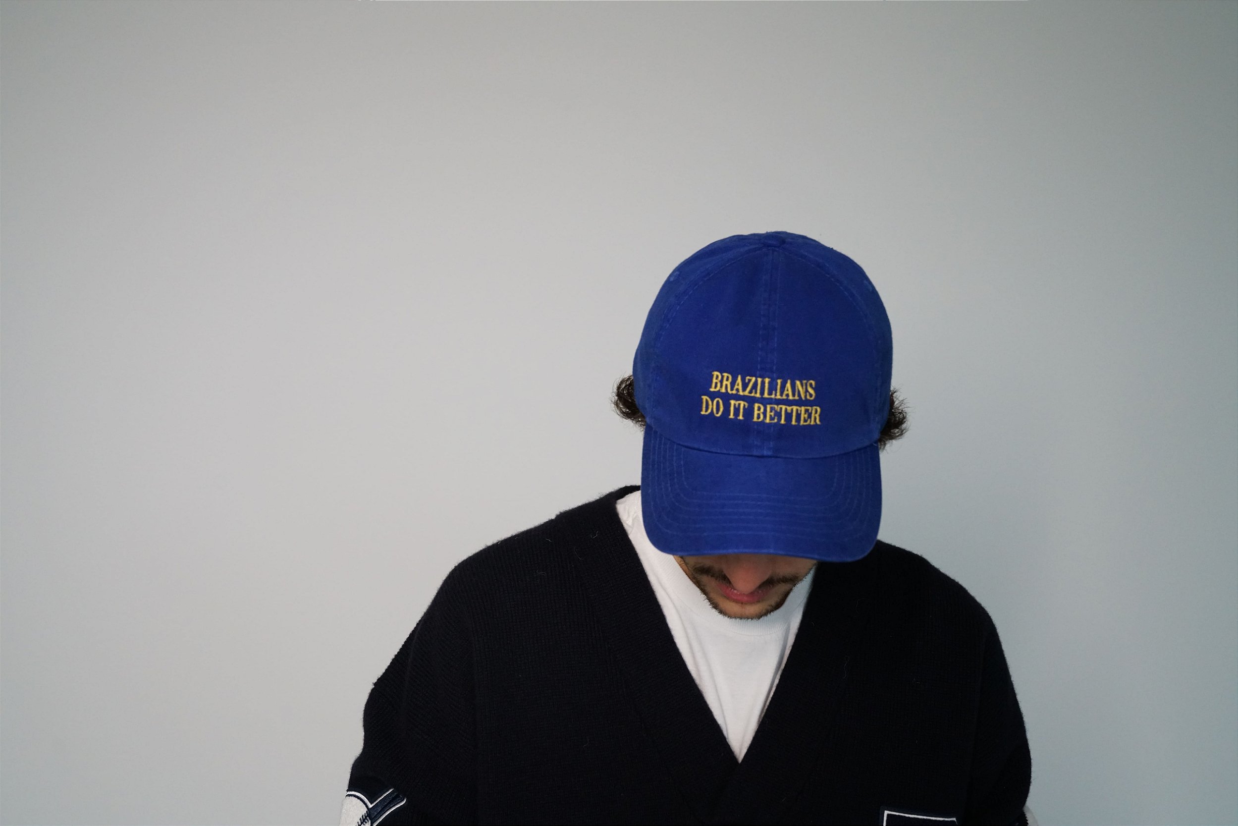 Boné azul royal de sarja bordado "brazilians do it better" em amarelo e ajuste em fivela regulável.