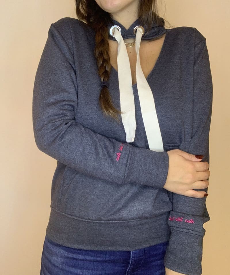 Moletinho cinza com capuz, cordão de ajuste, decote e bordado em pink nas mangas
